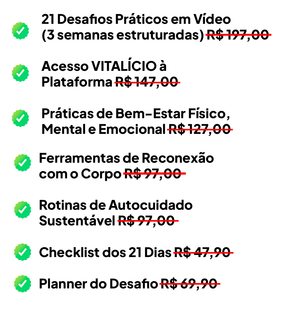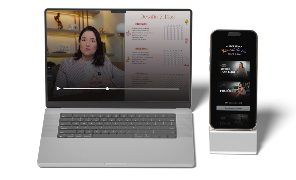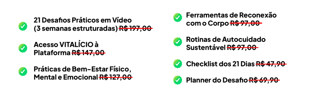 Você vai receber tudo que precisa para sair do automático, voltar a se olhar no espelho e se reconhecer. E isso vai fazer com que você diminua ansiedade, peso e bloqueios emocionais!